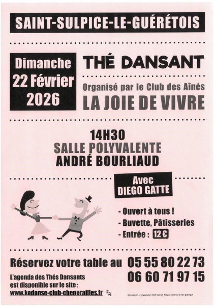 Date : Dimanche 22/02/2026 Horaires : 14h30 Tarifs : Entrée : 12€ Organisateur : CLUB DES AÎNÉS LA JOIE DE VIVRE Adresse de l'événement : SALLE ANDRÉ BOURLIAUD SALLE POLYVALENTE 23000 ST SULPICE LE GUERETOIS Informations complémentaires : Animation : Diego Gatte. Ouvert à tous. Buvette et pâtisseries. Danses pratiquées : Danses de salon, Danses en ligne (Line dance), Danses rétro Référence de l'annonce : 62689 call05 55 80 22 73call06 60 71 97 15