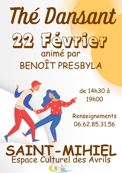 Date : Dimanche 22/02/2026 Horaires : de 14h30 à 19h Tarifs : 12€ Organisateur : COMITÉ DES FÊTES DE SAINT-MIHIEL Adresse de l'événement : ESPACE CULTUREL DES AVRILS AVENUE DU GÉNÉRAL-DE-GAULLE 55300 ST MIHIEL Informations complémentaires : Animation : Benoît Presbyla. Danses pratiquées : Danses de salon, Danses en ligne (Line dance), Danses rétro Référence de l'annonce : 62700 call06 62 85 31 56
