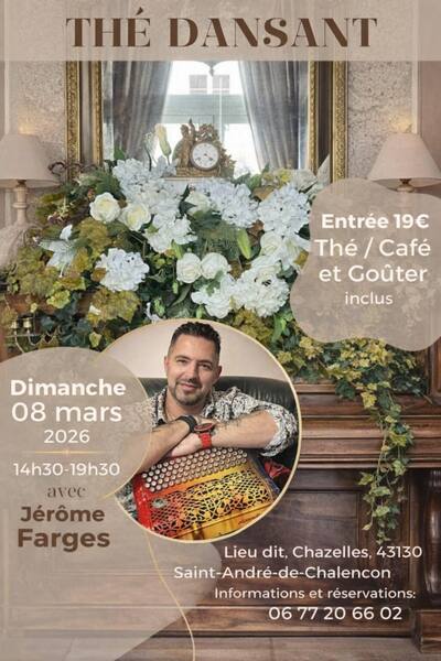 Date : Dimanche 08/03/2026 Horaires : 14h30 à 19h30 Tarifs : 19€ (thé/café et goûter inclus) Adresse de l'événement : CHÂTEAU DE CHAZELLES LIEU-DIT CHAZELLES 43130 ST ANDRE DE CHALENCON Informations complémentaires : Animation : Jérôme Farges. Danses pratiquées : Danses de salon, Danses en ligne (Line dance), Danses rétro Référence de l'annonce : 63227 call06 77 20 66 02
