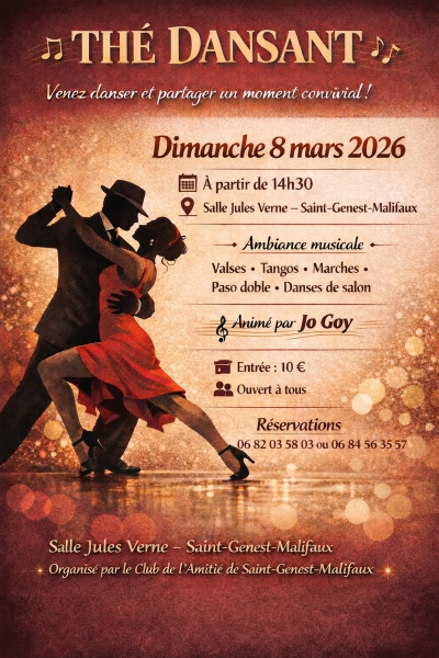 Date : Dimanche 08/03/2026 Horaires : 14h30 Tarifs : 10€ Organisateur : CLUB DE L'AMITIÉ Adresse de l'événement : SALLE JULES VERNE 5 RUE DE L'ÉTANG 42660 ST GENEST MALIFAUX Informations complémentaires : Animation : Jo Goy. Danses de salon (valses, tangos, marches, paso doble). Ouvert à tous. Danses pratiquées : Danses de salon, Danses en ligne (Line dance), Danses rétro, Paso-doble, Tango Référence de l'annonce : 64445 call06 84 56 35 57call06 82 03 58 03