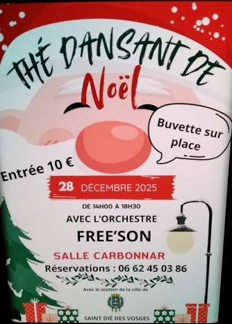 Date : Dimanche 28/12/2025 Horaires : de 14h à 18h30 Tarifs : 10€ Organisateur : FARANDOLE Adresse de l'événement : SALLE CARBONNAR 27 PLACE DE L'EUROPE 88100 ST DIE DES VOSGES Informations complémentaires : Animation : Orchestre Free'Son. Accès adapté aux personnes à mobilité réduite. Buvette sur place. Soutien de la ville de Saint-Dié-des-Vosges. Danses pratiquées : Danses de salon, Danses en ligne, Danses rétro Référence de l'annonce : 58076 call06 62 45 03 86