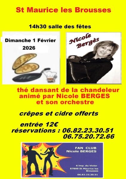 Date : Dimanche 01/02/2026 Horaires : 14h30 Tarifs : Entrée 12€ Organisateur : FAN CLUB NICOLE BERGÈS Adresse de l'événement : SALLE DES FÊTES 87800 ST MAURICE LES BROUSSES Informations complémentaires : Animation : Nicole Bergès et son orchestre. Crêpes et cidre offerts. Danses pratiquées : Danses de salon, Danses en ligne, Danses rétro Référence de l'annonce : 61661 call06 82 23 30 51call06 75 20 72 66
