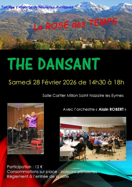 Date : Samedi 28/02/2026 Horaires : de 14h30 à 18h Tarifs : 12€ Organisateur : ASSOCIATION LE ROSE DES TEMPS Adresse de l'événement : SALLE CARTIER MILLON 180 CHEMIN DE LA MAIRIE 38330 ST NAZAIRE LES EYMES Informations complémentaires : Animation : Orchestre Alain Robert. Boissons et pâtisseries sur place. Règlement à l'entrée de la salle. Danses pratiquées : Danses de salon, Danses en ligne (Line dance), Danses rétro Référence de l'annonce : 62747 call04 76 52 40 28