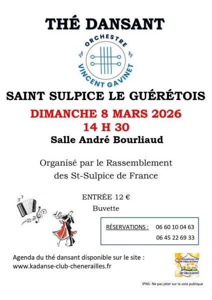 Date : Dimanche 08/03/2026 Horaires : 14h30 Tarifs : Entrée 12€ Organisateur : RASSEMBLEMENT DES SAINT-SULPICE DE FRANCE Adresse de l'événement : SALLE ANDRÉ BOURLIAUD 23000 ST SULPICE LE GUERETOIS Informations complémentaires : Animation : Orchestre Vincent Gavinet. Buvette. Danses pratiquées : Danses de salon, Danses en ligne (Line dance), Danses rétro Référence de l'annonce : 63922 call06 45 22 69 33call06 60 10 04 63