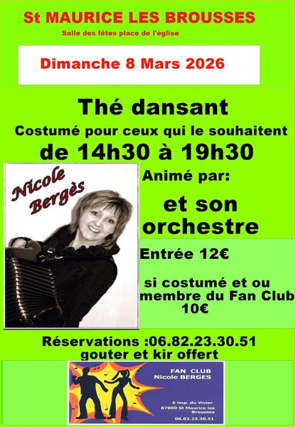 Date : Dimanche 08/03/2026 Horaires : 14h30 à 19h30 Tarifs : 12€ (10€ si costumé ou membre du Fan Club) Organisateur : FAN CLUB NICOLE BERGÈS Adresse de l'événement : SALLE DES FÊTES PLACE DE L'ÉGLISE 87800 ST MAURICE LES BROUSSES Informations complémentaires : Animation : Nicole Bergès et son orchestre. Goûter et kir offert. Costumes bienvenus. Danses pratiquées : Danses de salon, Danses en ligne (Line dance), Danses rétro Référence de l'annonce : 64243 call06 82 23 30 51