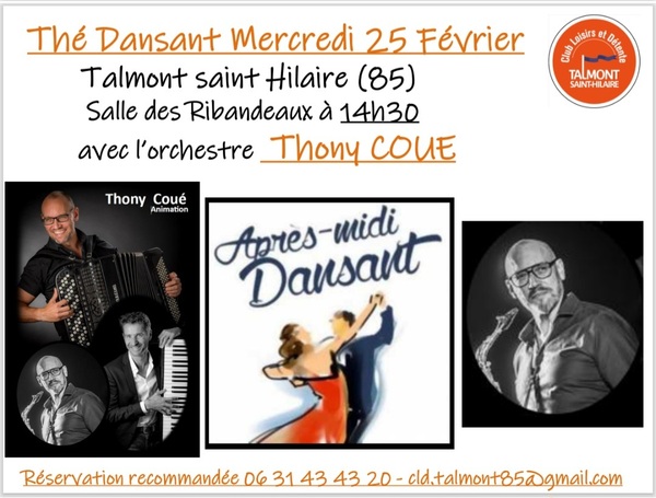 Date : Mercredi 25/02/2026 Horaires : 14h30 19h30 Tarifs : 11€ Organisateur : CLUB LOISIRS ET DÉTENTE Adresse de l'événement : 2 RUE DES RIBANDEAUX 85440 TALMONT ST HILAIRE Informations complémentaires : Thony Coué. Gouter à 17h avec brioche fraiche, chocolat maison, café, boissons Danses pratiquées : Danses de salon Référence de l'annonce : 63289 call06 31 43 43 20