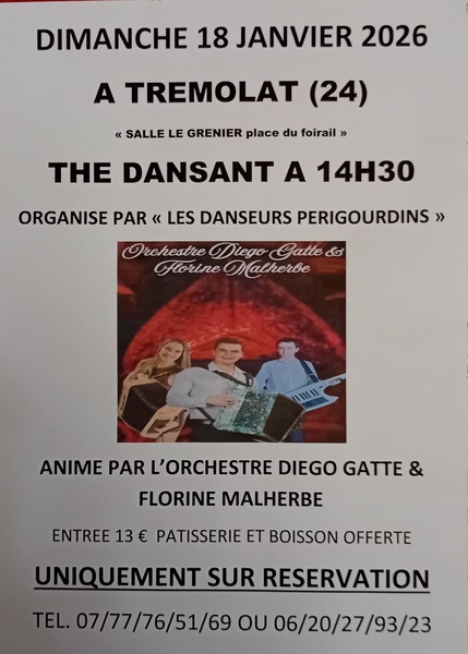 Date : Dimanche 18/01/2026 Horaires : 14h30 Tarifs : 13€ Organisateur : LES DANSEURS PÉRIGOURDINS Adresse de l'événement : SALLE LE GRENIER PLACE DU FOIRAIL 24510 TREMOLAT Informations complémentaires : Animation : Orchestre Diego Gatte & Florine Malherbe. Pâtisserie et boisson offertes. Réservation obligatoire. Danses pratiquées : Danses de salon, Danses en ligne (Line dance), Danses rétro Référence de l'annonce : 61686 call07 77 76 51 69call06 20 27 93 23