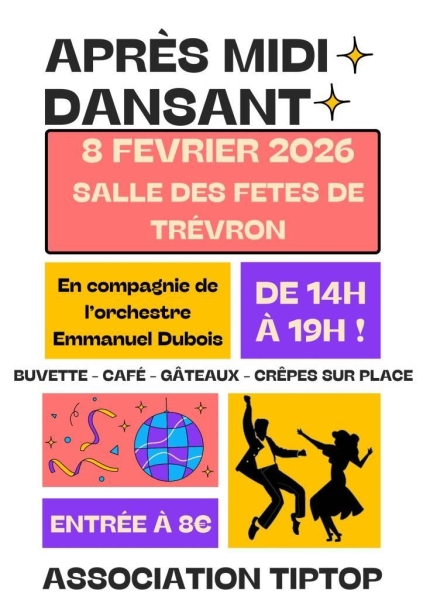 Date : 08/02/2026 (Événement passé) Horaires : 14h à 19h Tarifs : 8€ Organisateur : ASSOCIATION TIPTOP Adresse de l'événement : SALLE DES FÊTES BOURG 22100 TREVRON Informations complémentaires : Animation : Orchestre Emanuel Dubois. Buvette, café, gâteaux et crêpes sur place. Danses pratiquées : Danses de salon, Danses en ligne (Line dance), Danses rétro Référence de l'annonce : 62435 call02 96 83 58 14