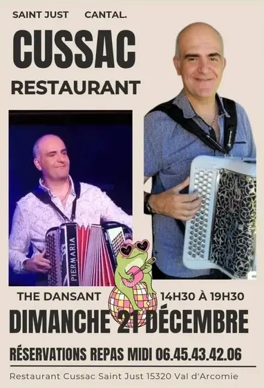 Date : Dimanche 21/12/2025 Horaires : 14h30 à 19h30 Organisateur : RESTAURANT CUSSAC Adresse de l'événement : RESTAURANT CUSSAC SAINT-JUST 15320 VAL D ARCOMIE Informations complémentaires : Animation : Orchestre Yannick Leybros. Danses pratiquées : Danses de salon, Danses en ligne, Danses rétro Référence de l'annonce : 53245 call06 45 43 42 06