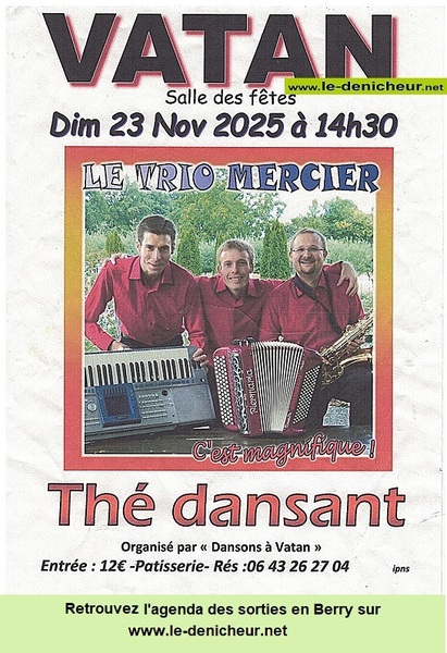 Date : Dimanche 23/11/2025 Horaires : 14h30 Tarifs : 12€ (pâtisserie incluse) Organisateur : DANSONS À VATAN Adresse de l'événement : SALLE DES FÊTES 36150 VATAN Informations complémentaires : Animation : Le Trio Mercier. Danses pratiquées : Danses de salon, Danses en ligne, Danses rétro Référence de l'annonce : 52450 call06 43 26 27 04