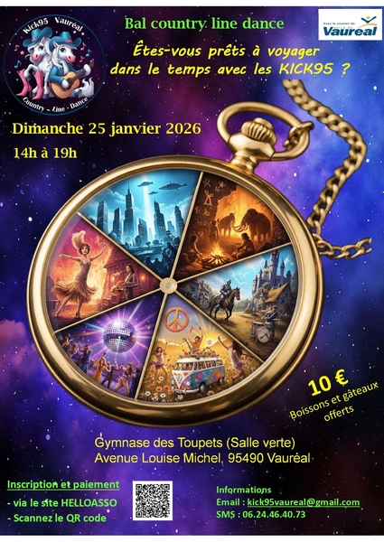 Date : Dimanche 25/01/2026 Horaires : 14h à 19h Tarifs : 10€ Organisateur : KICK95 Adresse de l'événement : GYMNASE DES TOUPETS (SALLE VERTE) AVENUE LOUISE-MICHEL 95490 VAUREAL Informations complémentaires : Boissons et gâteaux offerts. Inscriptions via HelloAsso (QR code sur l'affiche). Danses pratiquées : Country Référence de l'annonce : 56338 call06 24 46 40 73