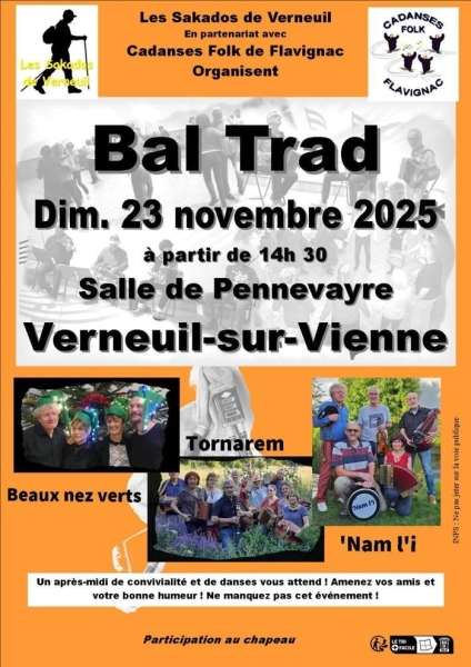 Date : Dimanche 23/11/2025 Horaires : 14h30 à 18h30 Tarifs : Participation au chapeau Organisateur : LES SAKADOS DE VERNEUIL Adresse de l'événement : SALLE DE PENNEVAYRES 87430 VERNEUIL SUR VIENNE Informations complémentaires : Animation : Beaux nez verts, Tornarem, Nam l?i. En partenariat avec Cadanses Folk de Flavignac. Après-midi de convivialité et de danses. Amenez vos amis et votre bonne humeur. Danses pratiquées : Danse folklorique Référence de l'annonce : 54877