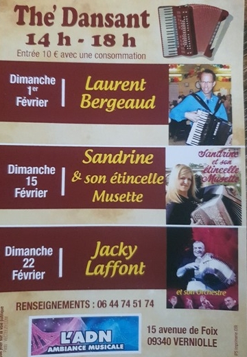 01/02/2026 : Animation "Laurent Bergeaud" 15/02/2026 : Animation "Sandrine & son Étincelle Musette" 22/02/2026 : Animation "Jacky Laffont et son orchestre" Danses pratiquées : Danses de salon, Danses en ligne (Line dance), Danses rétro Référence de l'annonce : 63059 call06 44 74 51 74
