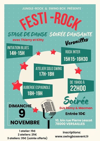 Date : Dimanche 09/11/2025 Horaires : 14h-22h Tarifs : 10/15/25 ou 35 euros Organisateur : SWINGBOX Adresse de l'événement : 10 BIS RUE PIERRE LESCOT 78000 VERSAILLES Informations complémentaires : Festi-Rock c'est un mini festival de danse sur une journée !