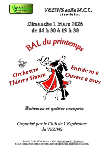 Date : Dimanche 01/03/2026 Horaires : 14h30 à 19h30 Tarifs : 10€ Organisateur : CLUB DE L'ESPÉRANCE DE VEZINS Adresse de l'événement : MAISON COMMUNE DE LOISIRS 14 RUE DU PARC 49340 VEZINS Informations complémentaires : Animation : Orchestre Thierry Simon. Ouvert à tous. Boissons et goûter compris. Danses pratiquées : Danses de salon, Danses en ligne (Line dance), Danses rétro Référence de l'annonce : 58901 call06 75 43 81 43