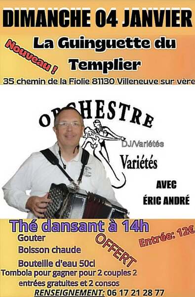 Date : Dimanche 04/01/2026 Horaires : 14h Tarifs : 12€ Organisateur : LA GUINGUETTE DU TEMPLIER Adresse de l'événement : 35 CHEMIN DE LA FIOLIE 81130 VILLENEUVE SUR VERE Informations complémentaires : Animation : orchestre de variétés avec Éric André. Goûter avec boisson chaude et bouteille d'eau 50 cl offerts. Tombola avec entrées et consommations à gagner pour 2 couples. Danses pratiquées : Danses de salon, Danses en ligne, Danses rétro, Variété Référence de l'annonce : 58982 call06 17 21 28 28call06 17 21 28 77