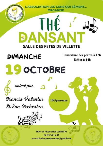 Date : Dimanche 19/10/2025 Horaires : 14h Tarifs : 10€ Organisateur : ASSOCIATION LES GENS QUI SEMENT Adresse de l'événement : SALLE DES FÊTES 54260 VILLETTE Informations complémentaires : Thé dansant le 19 octobre à la salle des fêtes de Villette 54 ouverture des portes à 13h