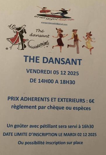 Date : Vendredi 05/12/2025 Horaires : 14h à 18h30 Tarifs : 6€ (adhérents et extérieurs) Organisateur : ENERGYM DANSE Adresse de l'événement : 110 RUE DU 4 AOÛT 1789 69100 VILLEURBANNE Informations complémentaires : Goûter servi vers 16h30 (pétillant inclus).