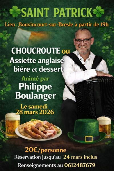 Date : Samedi 28/03/2026 Horaires : 19h Tarifs : 20€/personne Adresse de l'événement : 80100 ABBEVILLE Informations complémentaires : Animation : Orchestre Philippe Boulanger. Menu : choucroute ou assiette anglaise, bière et dessert. Réservation jusqu'au 24 mars inclus. Danses pratiquées : Danse celtique, Danse folklorique Référence de l'annonce : 65624 call06 12 48 76 79
