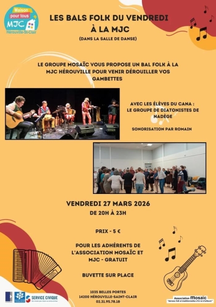 Date : Vendredi 27/03/2026 Horaires : 20h à 23h Tarifs : 5€ (gratuit pour les adhérents de l?association Mosaïc et de la MJC) Organisateur : ASSOCIATION MOSAÏC Adresse de l'événement : MJC D?HÉROUVILLE-SAINT-CLAIR 10 RUE DES BELLES PORTES 14600 ABLON Informations complémentaires : Animation : Groupe Mosaïc et élèves diatonistes de Nadège Queniet du CANA. Sonorisation par Romain. Buvette sur place. Dernier rendez-vous des vendredis Bal Folk. Danses pratiquées : Danse folklorique Référence de l'annonce : 64649 call02 31 95 78 18