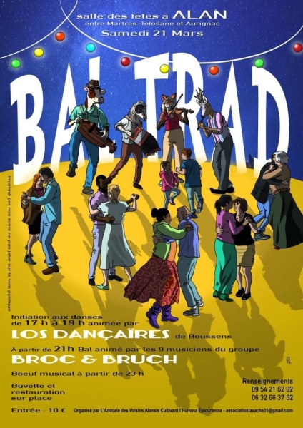 Initiation aux danses de 17h à 19h animée par Los Dancaïres de Boussens 21/03/2026 : Animation "Broc & Bruch" B?uf musical à partir de 23h Buvette et restauration sur place Repas sur réservation Danses pratiquées : Danse folklorique Référence de l'annonce : 64594 call09 54 21 62 02call06 32 66 57 52