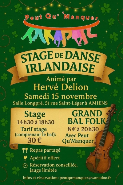 Date : Samedi 15/11/2025 Horaires : 14h30 à 18h30 et 20h30 Tarifs : Stage (bal inclus) : 30€. Entrée bal seul : 8€. Organisateur : PEUT QU'MANQUER Adresse de l'événement : SALLE LONGPRÉ 51 RUE SAINT-LÉGER 80000 AMIENS Informations complémentaires : Animation : Hervé Delion pour le stage, Peut Qu'Manquer pour le bal. Repas partagé. Apéritif offert. Réservation conseillée, jauge limitée. Bal débutant à 20h30.