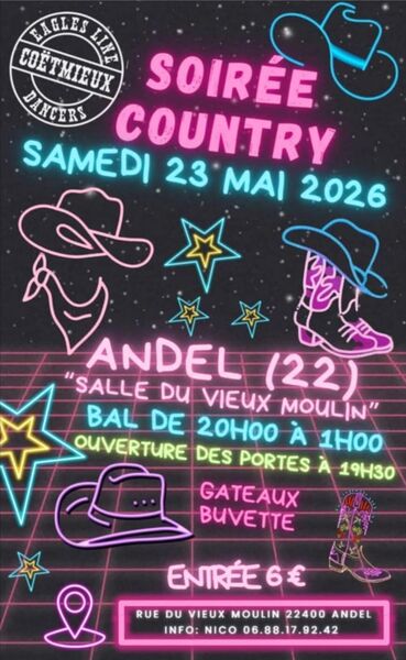 Date : Samedi 23/05/2026 Horaires : de 20h à 1h Tarifs : 6€ Organisateur : EAGLES LIVE COËTMIEUX DANCERS Adresse de l'événement : SALLE DU VIEUX MOULIN RUE DU VIEUX MOULIN 22400 ANDEL Informations complémentaires : Ouverture des portes à 19h30. Gâteaux et buvette sur place. Danses pratiquées : Country Référence de l'annonce : 50169