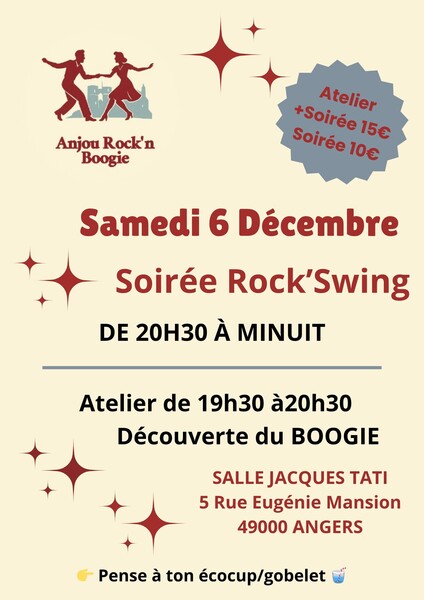 Date : Samedi 06/12/2025 Horaires : 19h30 à minuit Tarifs : Atelier + soirée : 15€ / Soirée seule : 10€ Organisateur : ANJOU ROCK'N BOOGIE Adresse de l'événement : SALLE JACQUES TATI 5 RUE EUGÉNIE MANSION 49000 ANGERS Informations complémentaires : Atelier découverte du boogie de 19h30 à 20h30. Soirée Rock/Swing de 20h30 à minuit. Apporter son écocup ou gobelet. Danses pratiquées : Rock, Swing Référence de l'annonce : 56424