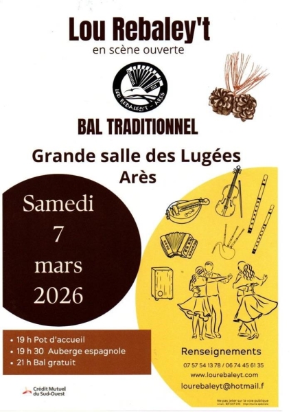 Date : Samedi 07/03/2026 Horaires : 19h à 23h Tarifs : Gratuit Organisateur : LOU REBALEYT Adresse de l'événement : GRANDE SALLE DES LUGÉES 31 ALLÉE DU DOMAINE DES LUGÉES 33740 ARES Informations complémentaires : Animation : scène ouverte. Pot d'accueil en chansons à 19h. Repas partagé type auberge espagnole à 19h30. Danses pratiquées : Danse folklorique Référence de l'annonce : 63843 call07 57 54 13 78call06 74 45 61 35