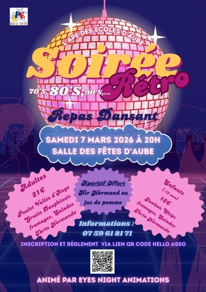 Date : Samedi 07/03/2026 Horaires : 20h Tarifs : Adultes 21€ Enfants (12 ans) 12€ Organisateur : APE DES ÉCOLES D'AUBE Adresse de l'événement : SALLE DES FÊTES 61270 AUBE Informations complémentaires : Animation : Eyes Night Animations. Repas dansant. Apéritif offert : kir normand ou jus de pomme. Menu adultes et enfants avec poulet Vallée d'Auge, gratin dauphinois, fromages-salades, tarte normande. Inscription avant le 3 mars 2026 via Hello Asso. Danses pratiquées : Danses de salon, Danses en ligne (Line dance), Danses rétro Référence de l'annonce : 63829 call07 59 61 81 71