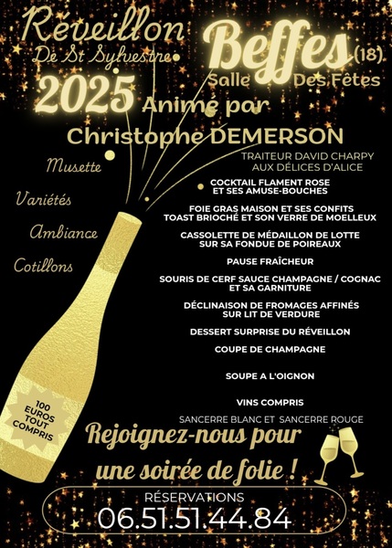 Date : Mercredi 31/12/2025 Horaires : 19h30 Tarifs : 100 Organisateur : FAN-CLUB Adresse de l'événement : SALLE DES FÊTES PLACE DU MARCHÉ 18320 BEFFES Informations complémentaires : Soirée de folie à Beffes pour le réveillon de St Sylvestre avec Christophe DEMERSON et son orchestre Danses pratiquées : Danses de salon Référence de l'annonce : 53376 call06 51 51 44 84