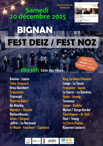 Date : Samedi 20/12/2025 Horaires : 16h Tarifs : 7€ (réduit 5€, gratuit moins de 18 ans) Organisateur : KANERION BRO BOÏO Adresse de l'événement : SALLE DES FÊTES 56500 BIGNAN Informations complémentaires : Pour célébrer la sortie du double CD « Pays de Locminé Bro Boël ». Animation : Koulma-Loeiza, Talec-Suignard, Brou-Quimbert, Trouzerion, Triorezed, Paotred Rubri, Ba Akoubig, Mandart / Bauch, Barbouillouzes, Lunan / Guigner, Jaffré-Le Normand, Er Mouël-Faucheur-Capitaine, King Laridenn Orkestar, Lange-Le Sauze, Françoise-Agnès, Le Corre-Le Quintrec, Anaïs-Annaïg, Taranous, Lange-Gueblez, Michel / Serge Kerdal, Pourchasse-Ar Gall, Hoël / Ivonig, Le Corre-Fustec, Kanerien Lestonan. Ventes de CD sur place. Danses pratiquées : Danse bretonne Référence de l'annonce : 56775 call06 35 97 07 34