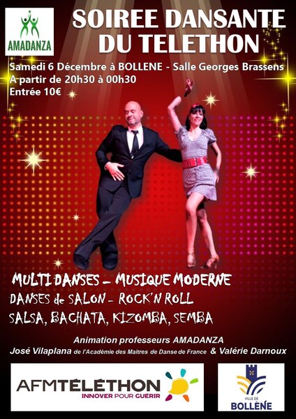 Date : Samedi 06/12/2025 Horaires : 20h30-00h30 Tarifs : 10€ Organisateur : AFM TÉLÉTHON Adresse de l'événement : SALLE GEORGES BRASSENS 84500 BOLLENE Informations complémentaires : Animation : professeurs Amadanza avec José Vilaplana et Valérie Darnoux. Danses pratiquées : multi-danses, musique moderne, danses de salon, rock'n'roll, salsa, bachata, kizomba, semba. Organisé avec la Ville de Bollène. Événement dans le cadre du Téléthon. Danses pratiquées : Bachata, Danses de salon, Kizomba, Rock, Salsa Référence de l'annonce : 56936