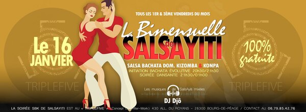 Date : Vendredi 16/01/2026 Horaires : 20h30 à 01h Tarifs : Entrée gratuite Organisateur : SALSAYITI Adresse de l'événement : TRIPLEFIVE 430 ALLÉE DU ROYANS 26300 BOURG DE PEAGE Informations complémentaires : Animation : DJ Djô. Soirée afro-caribéenne. Initiation bachata évolutive de 20h30 à 21h30. Tous les 1er et 3e vendredis du mois. Anciennement Les Voûtes. Danses pratiquées : Bachata, Kizomba, Salsa Référence de l'annonce : 61053 call06 79 85 42 76