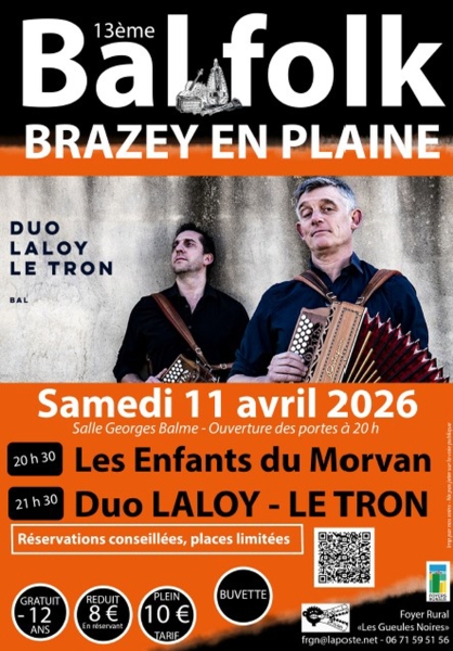 Date : Samedi 11/04/2026 Horaires : de 20h30 à 23h55 Tarifs : Gratuit < 12 ans. Réduit 8€ en réservation. Plein 10€ sur place. Organisateur : FOYER RURAL LES GUEULES NOIRES Adresse de l'événement : SALLE DES FÊTES GEORGES BALME RUE JOSEPH MAGNIN 21470 BRAZEY EN PLAINE Informations complémentaires : Ouverture des portes à 20h. 20h30 : Animation "Les Enfants du Morvan" 21h30 : Animation "Duo Laloy-Le Tron". Buvette. Réservations conseillées, places limitées. Accès adapté aux personnes à mobilité réduite. Danses pratiquées : Danse folklorique Référence de l'annonce : 65110 call06 71 59 51 56