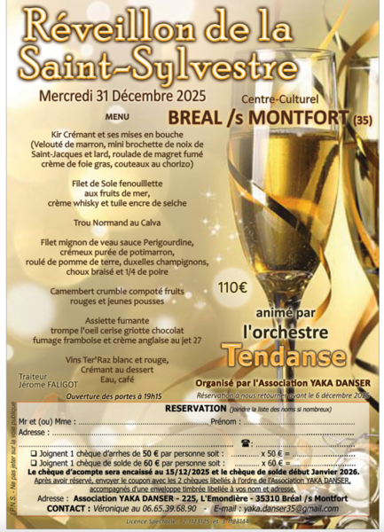 Date : Mercredi 31/12/2025 Horaires : 19h30 Tarifs : 110€ Organisateur : ASSOCIATION YAKA DANSER Adresse de l'événement : CENTRE CULTUREL 35310 BREAL SOUS MONTFORT Danses pratiquées : Danses de salon, Danses en ligne, Danses rétro Référence de l'annonce : 53120 call06 65 39 68 90call06 45 39 96 05