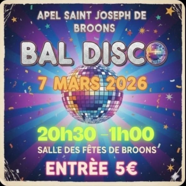 Date : Samedi 07/03/2026 Horaires : 20h30 à 1h Tarifs : 5€ Organisateur : APEL SAINT JOSEPH DE BROONS Adresse de l'événement : SALLE DES FÊTES 7 RUE DE PLUMAUGAT 22250 BROONS Danses pratiquées : Disco Référence de l'annonce : 63830