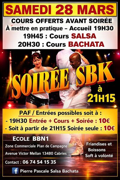 Venez retrouver Pierre professeur de Salsa et de Bachata chez Bebop N1, Pascale professeur assistante et leur équipe pour une soirée SBK conviviale et exceptionnelle.