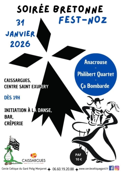 Date : Samedi 31/01/2026 Horaires : 19h à 23h Tarifs : 10€ Organisateur : CERCLE CELTIQUE DU GARD POLIG MONJARRET Adresse de l'événement : CENTRE SAINT-EXUPÉRY AVENUE DE LA DAME 30132 CAISSARGUES Informations complémentaires : Initiation à la danse bretonne suivie d?un fest-noz. Animation : Anacrouse, Ça Bombarde, Philibert Quartet. Crêperie bretonne et buvette. Danses pratiquées : Danse bretonne Référence de l'annonce : 61253 call06 60 19 20 88