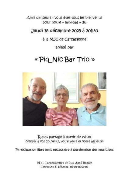 Date : Jeudi 18/12/2025 Horaires : 20h30 à 22h30 Tarifs : Participation libre Organisateur : MJC DE CARCASSONNE Adresse de l'événement : MJC DE CARCASSONNE 91 RUE AIMÉ RAMOND 11000 CARCASSONNE Informations complémentaires : Animation : Piq-Nic Bar Trio. Repas partagé à partir de 19h, apporter vos couverts, verre et assiette. Violons, mandoline, guitare et accordéon diatonique. Participation nécessaire destinée aux musiciens. Danses pratiquées : Danse folklorique Référence de l'annonce : 56215 call06 04 46 68 08