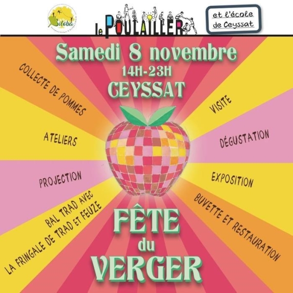 Date : Samedi 08/11/2025 Horaires : 19h à 22h30 Organisateur : LE POULALLIER ET L'ÉCOLE DE CEYSSAT Adresse de l'événement : RUE DU VILLAGE 63210 CEYSSAT Informations complémentaires : Animation : La Fringale de Trad et Feulz. Fête du Verger. Collecte de pommes. Ateliers. Projection. Visite. Dégustation. Exposition. Buvette et restauration. Danses pratiquées : Danse folklorique Référence de l'annonce : 54180