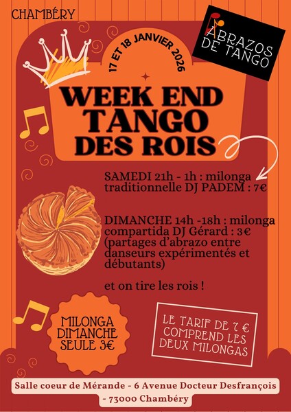 17/01/2026 : Animation "DJ Padem" 18/01/2026 : Animation "DJ Gérard" Partages entre danseurs expérimentés et débutants. Galette des Rois. Danses pratiquées : Tango, Tango argentin Référence de l'annonce : 61728