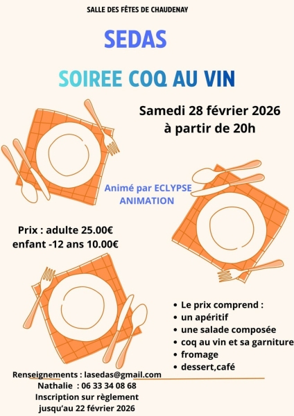 Date : Samedi 28/02/2026 Horaires : 20h Tarifs : 25€ adulte, 10€ -12 ans Organisateur : SEDAS Adresse de l'événement : SALLE DES FÊTES RUE DU 11 NOVEMBRE 71150 CHAUDENAY Informations complémentaires : Animation : Eclypse Animation. Accès adapté aux personnes à mobilité réduite. Inscriptions jusqu'au 22 février 2026. Menu : apéritif, salade composée, coq au vin avec garniture, fromage, dessert, café. Tarif tout compris sauf boissons. Danses pratiquées : Danses de salon, Danses en ligne (Line dance), Danses rétro Référence de l'annonce : 63766 call06 06 66 27 31call06 33 34 08 68