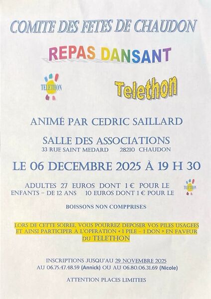 Date : Samedi 06/12/2025 Horaires : 19h30 Tarifs : Adultes 27€ dont 1€ pour le Téléthon. Enfants de moins de 12 ans 10€ dont 1€ pou Organisateur : COMITÉ DES FÊTES DE CHAUDON Adresse de l'événement : SALLE DES ASSOCIATIONS 33 RUE SAINT-MÉDARD 28210 CHAUDON Informations complémentaires : Animation : Orchestre Cédric Saillard. Boissons non comprises. Inscriptions jusqu'au 29 novembre 2025. Attention places limitées. Participation à l'opération "1 pile = 1 don" en faveur du Téléthon, possibilité de déposer des piles usagées. Danses pratiquées : Danses de salon, Danses en ligne, Danses rétro Référence de l'annonce : 57003 call06 75 47 48 59call06 80 06 31 69