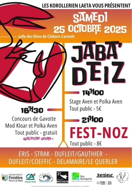 Date : Samedi 25/10/2025 Horaires : 14h#16h30#21h Tarifs : Stage 5€ Concours gratuit Fest-noz 8€ Organisateur : CERCLE CELTIQUE KOROLLERIEN LAETA Adresse de l'événement : SALLE DES FÊTES 7 RUE PIERRE JACOB DIT TALCOAT 29360 CLOHARS CARNOET Informations complémentaires : Animation : Gilles et Evelyne Le Meurlay, Maïwenn Le Meurlay, Eris-Strak-Dufleit, Gauthier-Dufleit, Coeffic-Le Querler, Delamaire. Concours qualificatif pour le championnat de danses de Gourin 2026. Fest-noz sur parquet. Tout public. Danses pratiquées : Danse bretonne, Polka Référence de l'annonce : 51575