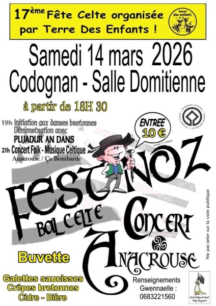 Date : Samedi 14/03/2026 Horaires : 18h30 à 23h55 Tarifs : 10€ Organisateur : TERRE DES ENFANTS Adresse de l'événement : SALLE DOMITIENNE RUE DU LEVANT 30920 CODOGNAN Informations complémentaires : Initiation aux danses bretonnes à 19h. Animation : Plijadur An Dans, groupe du Cercle Celtique du Gard. Concert Folk et Musique Celtique à 21h avec Anacrouse et Ça Bombarde. Buvette. Galettes saucisses. Crêpes bretonnes. Cidre et bière proposés. Danses pratiquées : Danse bretonne Référence de l'annonce : 63952 call06 83 22 15 60