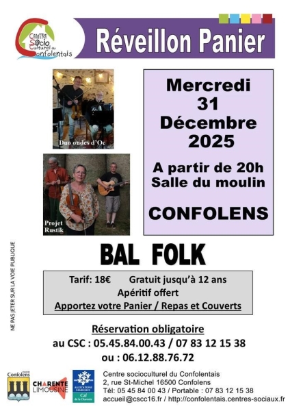 Date : Mercredi 31/12/2025 Horaires : 20h Tarifs : 18€, gratuit jusqu'à 12 ans Organisateur : CENTRE SOCIOCULTUREL DU CONFOLENTAIS Adresse de l'événement : SALLE DU MOULIN RUE DU MOULIN 16500 CONFOLENS Informations complémentaires : Animation : Duo Ondes d'OC et Projet Rustik. Bal folk. Apéritif offert. Apportez votre repas et vos couverts. Réservation obligatoire. Danses pratiquées : Danse folklorique Référence de l'annonce : 56851 call05 45 84 00 43call07 83 12 15 38