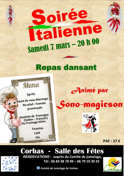 Date : Samedi 07/03/2026 Horaires : 20h Tarifs : 37€ Organisateur : COMITÉ DE JUMELAGE Adresse de l'événement : SALLE DES FÊTES PLACE CHARLES-JOCTEUR 69960 CORBAS Informations complémentaires : Animation : Magic-Sono. Repas dansant. Menu : Spritz, sauté de veau Marengo, riz pilaf, tomate provençale, assiette de fromages (italien ou français) ou fromage blanc, tiramisu, café, vin. Réservations auprès du Comité de jumelage. Danses pratiquées : Danses de salon, Danses en ligne (Line dance), Danses rétro Référence de l'annonce : 65079 call06 84 48 91 62call06 79 10 39 25