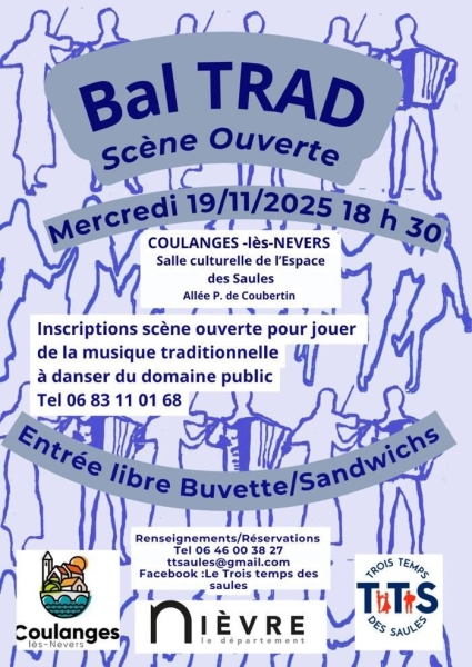 Date : Mercredi 19/11/2025 Horaires : 18h30 à 22h30 Tarifs : Entrée gratuite Organisateur : TROIS TEMPS DES SAULES Adresse de l'événement : SALLE CULTURELLE DE L?ESPACE DES SAULES ALLÉE PIERRE-DE-COUBERTIN 58660 COULANGES LES NEVERS Informations complémentaires : Buvette et sandwichs. Scène ouverte pour jouer de la musique traditionnelle à danser du domaine public. Danses pratiquées : Danse folklorique Référence de l'annonce : 54404 call06 83 11 01 68call06 46 00 38 27