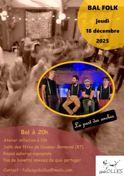 Date : Jeudi 18/12/2025 Horaires : 19h à 23h Tarifs : À partir de 6€ Organisateur : FOLLES GUIBOLLES Adresse de l'événement : SALLE DES FÊTES 87500 COUSSAC BONNEVAL Informations complémentaires : Animation : La Part des Anches. Atelier d'initiation de 19h à 20h ouvert à tous les niveaux. Bal à partir de 20h. Repas en auberge espagnole. Pas de buvette, chacun peut apporter de quoi partager. Danses pratiquées : Danse folklorique Référence de l'annonce : 56216